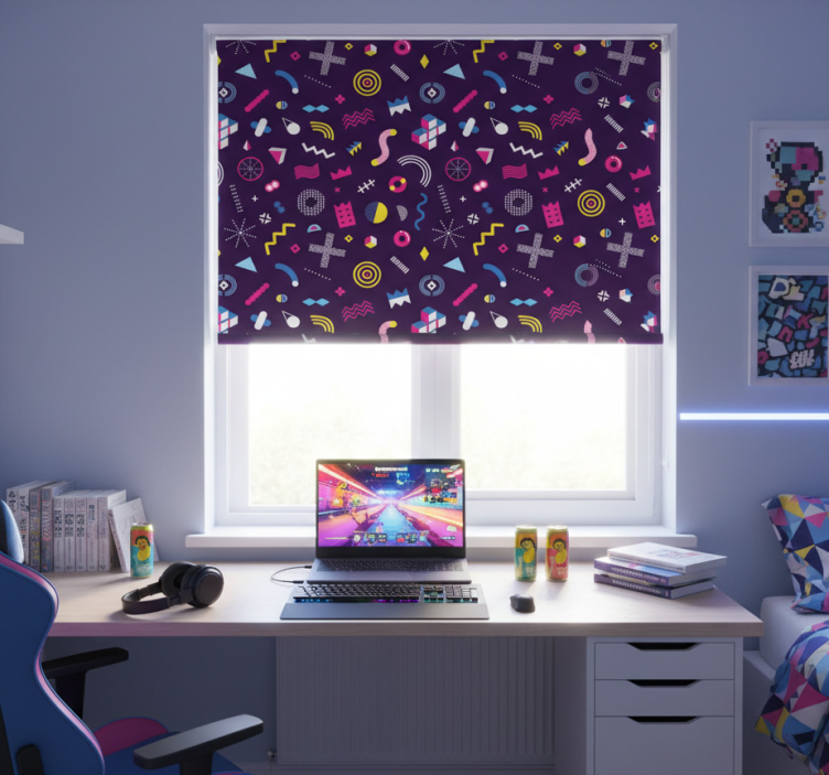 Reference: E7429Introducing our stunning Blind teens memphis gaming design, a vibrant and playful addition to your space! This roller blind features an eye-catching Memphis-inspired graphic that combines bold colors and geometric shapes, perfect for any gaming enthusiast. With easy assembly in just 2 clicks, easy cleaning, and disassembly for quick maintenance, this design not only enhances your room's aesthetic but also offers practical benefits. It protects your space from direct sunlight while providing privacy when lowered, allowing you to enjoy your gaming experience without interruptions!