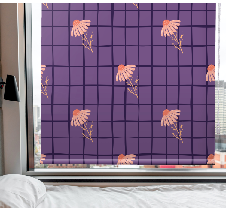 living room blind and start making your home unique! This design features multiple daisies over a purple checked pattern, use it in any room of your house, it will look amazing no matter where! All of ourliving room roller blinds