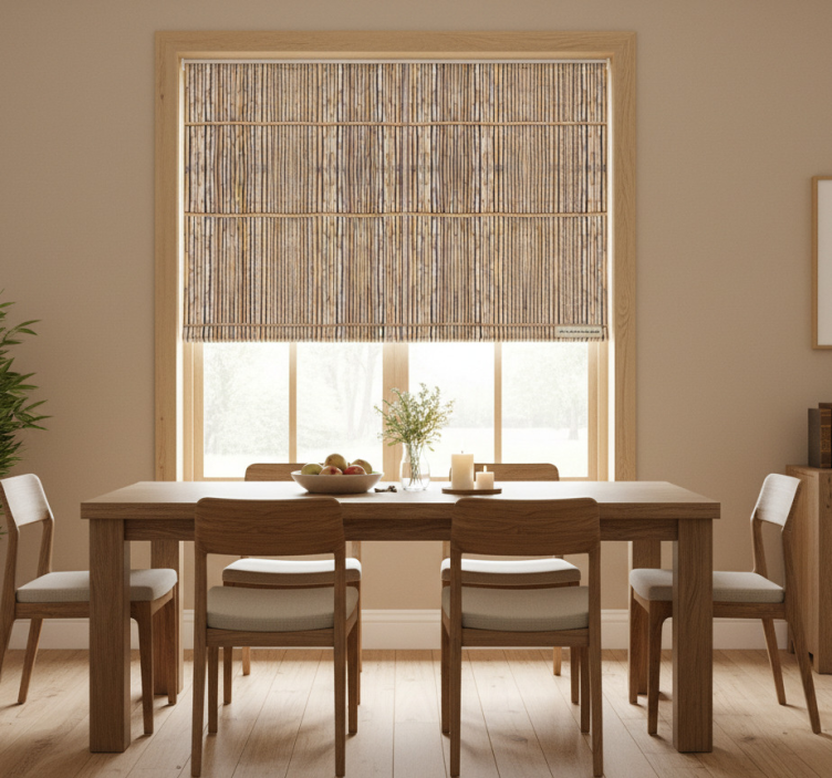 Reference: E6549Transform your living space with our Dining room blind handcrafted bamboo look canes. This stunning design features a natural bamboo aesthetic that blends seamlessly into any decor style, creating a warm and inviting atmosphere. With easy assembly in just two clicks, effortless cleaning, and the ability to regulate room temperature, this roller blind is both functional and beautiful. It protects your privacy while allowing natural light to filter through, enhancing the overall ambiance of your dining room.