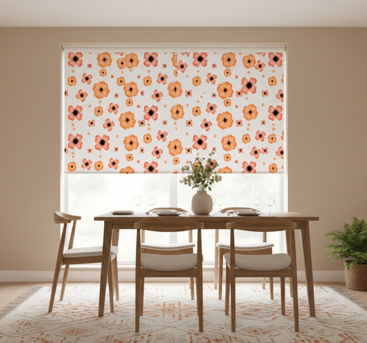 The Dining room blind in orange and pink watercolor pattern dining room blind is an exceptional choice for anyone looking to elevate their home decor. Its artistic design not only enhances the aesthetic appeal of your dining space but also creates a cheerful atmosphere where family and friends can gather. This roller blind allows you to express your personality and style while providing essential privacy and light control, making it a must-have for any stylish home!