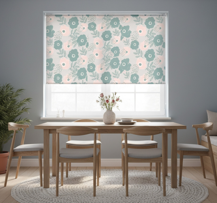 Dining room blind in pink and blue watercolor flowers