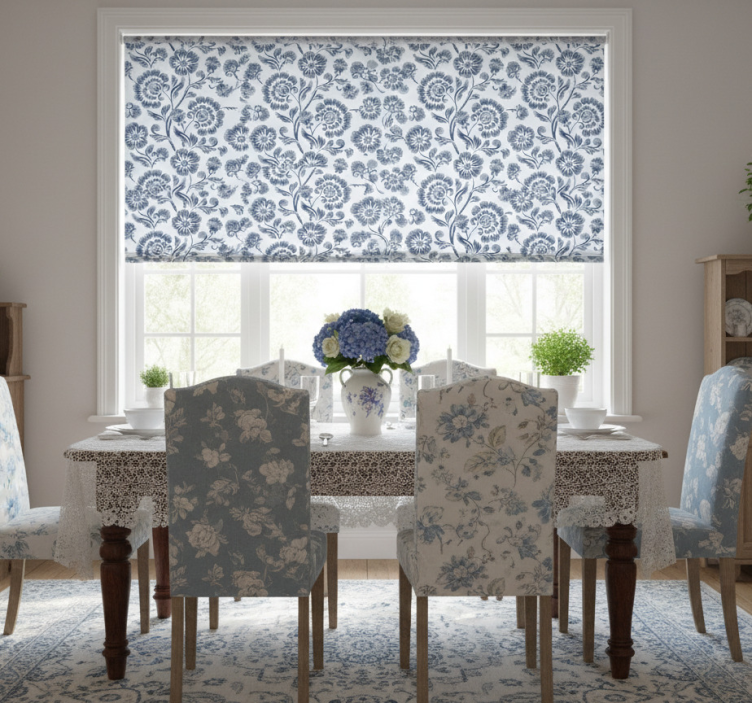 Reference: E6569Transform your living space with our stunning Dining room blind with blue flowers grandmillenial pattern. This exquisite design features a vibrant blue floral motif that captures the essence of grandmillennial style. The intricate patterns are beautifully crafted, making them an eye-catching addition to any dining room. With easy assembly in just two clicks, effortless cleaning, and the ability to customize measurements, this roller blind is the perfect blend of functionality and aesthetics!