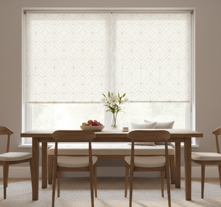 Reference: E6682Transform your living space with our Dining room blind with contemporary geometric design, an exquisite combination of style and functionality! Featuring a stunning geometric pattern that enhances the modern aesthetic of your dining area, this blind is designed to provide both elegance and practicality. The easy assembly in just 2 clicks, effortless cleaning, and quick disassembly allow for a hassle-free experience. Enjoy the benefits of privacy when lowered and the ability to regulate room temperature, all while protecting your space from direct sunlight.