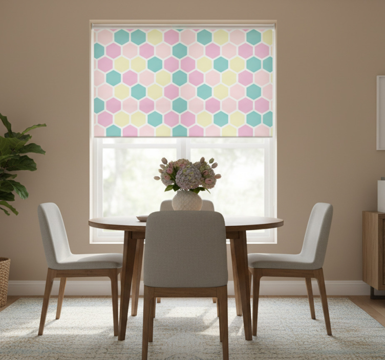 Dining room blind with geometric pattern and pastel colors