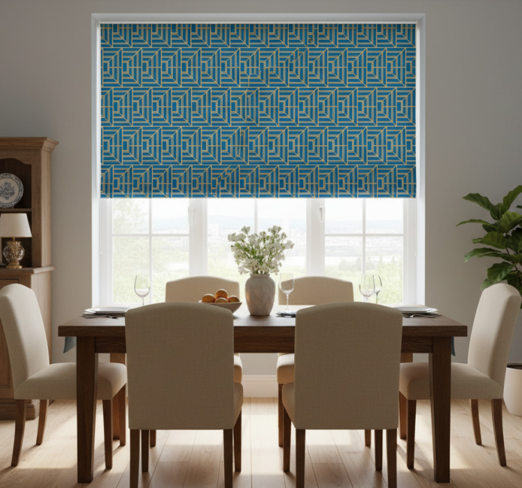 Reference: E6679Transform your living space with our stunning Dining room blind with gold lines on blue. This exquisite design features elegant gold lines gracefully intertwined on a rich blue background, creating a captivating visual appeal that enhances the aesthetics of any dining room. Its unique color combination not only adds a touch of luxury but also serves as a conversation starter, making it perfect for both casual meals and sophisticated gatherings.