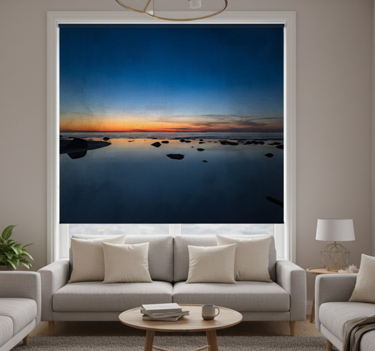 Reference: E8560Transform your living space with the stunning Living room blind nordic sunset over the sea, a beautiful blend of serene colors and captivating designs that evoke the tranquility of a sunset over the ocean. This roller blind features easy assembly in just two clicks, allows for effortless cleaning and disassembly, and provides essential privacy and light control while enhancing your room's aesthetic appeal.