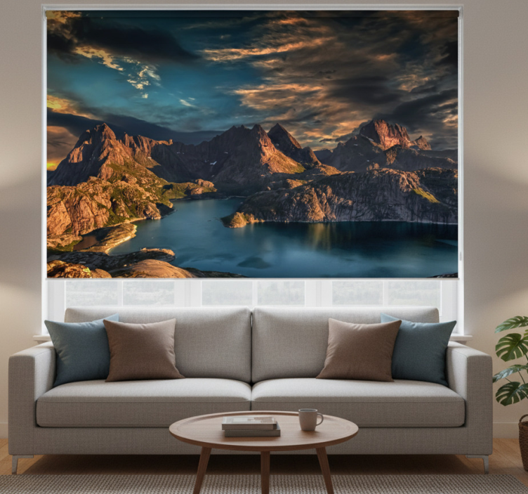 Reference: E8960Transform your living space with our stunning Living room blind norwegian landscape sea and mountains, featuring breathtaking graphics that capture the serene beauty of Norway. This exquisite design showcases majestic mountains rising above tranquil seas, enveloped in a harmonious blend of colors that evoke a sense of peace and tranquility. The roller blind not only enhances your decor but also offers functionality with its easy assembly, effortless cleaning, and customizable textures to suit your light and privacy needs.