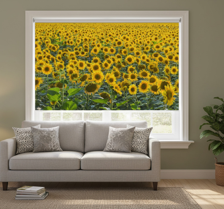 Living room blind sunflower field at sunset