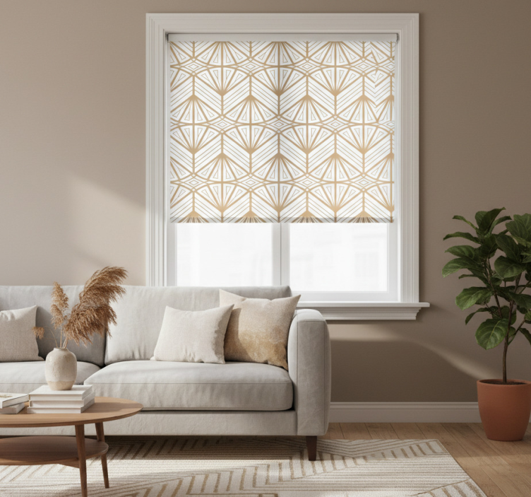 Reference: E7624Transform your living space with our modern blind with golden geometric design. This exquisite roller blind features a stunning golden geometric pattern that effortlessly blends contemporary elegance with functional design. With its easy assembly in just two clicks, this blind is perfect for anyone seeking a stylish solution for their windows. You can easily clean it and disassemble it just as swiftly, making maintenance a breeze. Additionally, it protects your room from harsh sunlight while providing privacy when lowered, ensuring comfort and security in your home. Enjoy the flexibility of regulating room temperature and choose from three different textures to match your desired light and privacy levels. Featuring a convenient chain mechanism for raising and lowering, this roller blind is a must-have for any modern home.