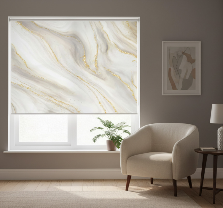 Reference: E9972Transform your space with our White window blind with white and gold marble design, a stunning blend of elegance and modernity. The intricate marble pattern beautifully contrasts with the pristine white backdrop, creating a sophisticated look that enhances any room's aesthetic. This versatile roller blind not only beautifies your windows but also offers practical benefits, including easy assembly and disassembly in just two clicks, making cleaning a breeze. Enjoy the benefits of enhanced privacy, effective sunlight protection, and customizable measurements that cater to your specific needs.
