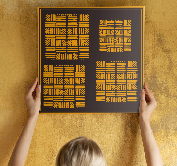 This modern canvas art geometric design arrangement is a stunning blend of vibrant colors and intricate patterns. Featuring an enchanting mix of African influences, golden hues, and abstract shapes, this artwork captivates with its elegant lines and grid formations. The beautiful yellow tones combined with abstract designs create a harmonious visual experience that will brighten any space.