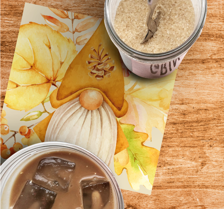 Embrace the magic of autumn with our Halloween coaster with autumnal gnome design. This whimsical design features vibrant colors and hand-drawn illustrations of folklore characters, bringing to life delightful garden gnomes and charming dwarfs amidst a flurry of autumn leaves. The enchanting scene perfectly captures the essence of the season, creating a warm and inviting atmosphere in your home.