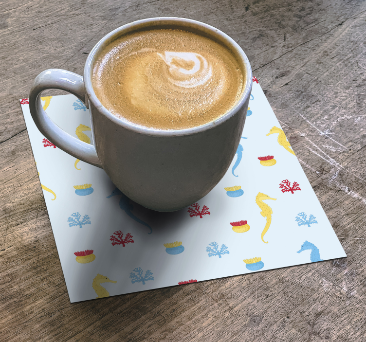 has a light blue background with a colourful seahorse and coral pattern. Get in different sizes.