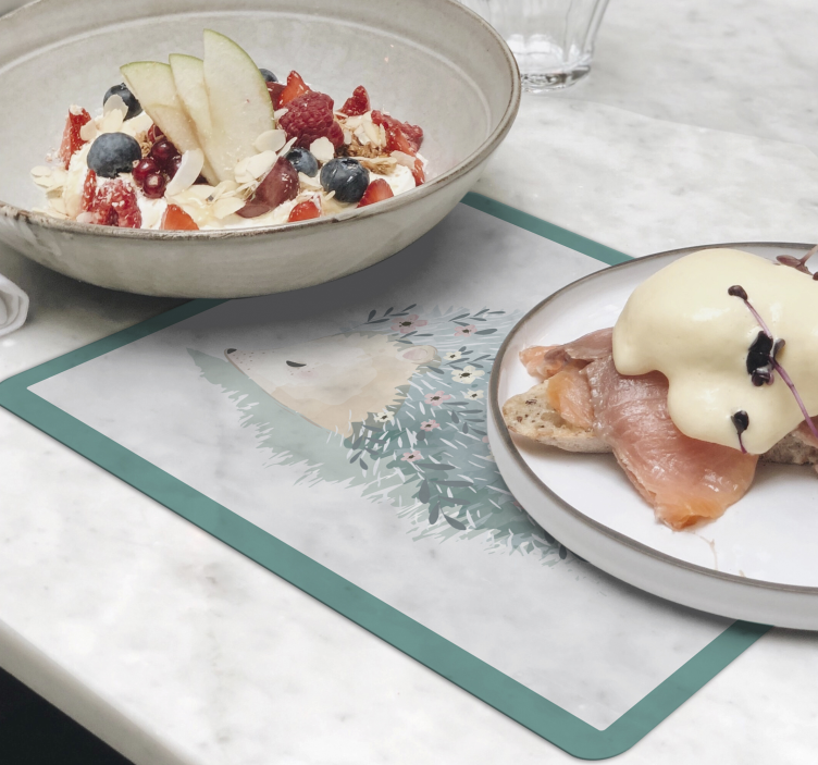 Introducing our charming Children placemats cute hedgehog illustration, featuring a delightful design that captures the essence of nature with whimsical watercolour artwork. The playful portrayal of a hedgehog amidst a vibrant marble backdrop, complemented by enchanting flora, adds a touch of magic to your child's dining experience. This adorable animal-themed placemat is perfect for sparking joy at mealtime!