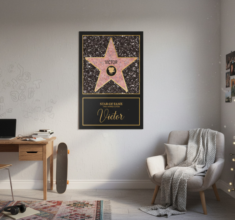 Reference: G759Introducing our stunning Living room poster custom star of fame, a unique design that captures the essence of stardom in your home! This eye-catching poster features a 180g/m2 grammage for durability, a semi-matt finish without reflections for a sleek look, and an incredible high colour intensity that brings vibrancy to any space.