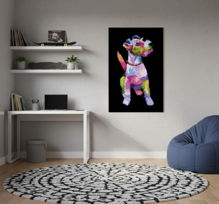 Reference: G775Introducing our stunning Living room poster geometric fox terrier art, a beautiful blend of contemporary design and playful charm. This artwork features a geometric representation of a fox terrier, showcasing vibrant colors and high colour intensity that will enliven any space. With its semi-matt finish that prevents reflections, this poster is printed on high-quality 180g/m2 paper, making it ideal for posters that demand attention and admiration.