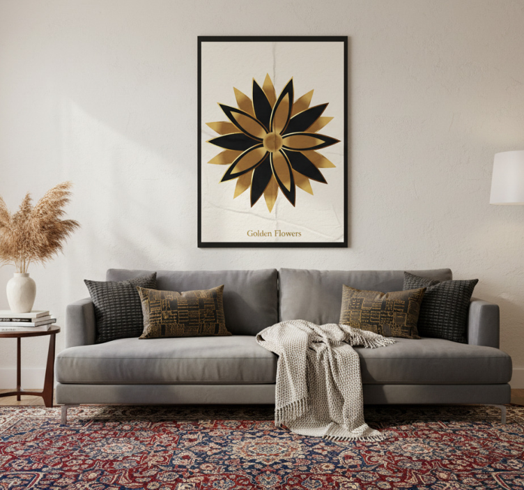 Reference: G859Introducing our stunning Living room poster of golden flowers, a captivating design that beautifully combines a rich golden palette with intricate floral patterns. This poster features a 180g/m2 grammage that ensures durability, a semi-matt finish that eliminates reflections, and high color intensity that brings vibrancy to your space.
