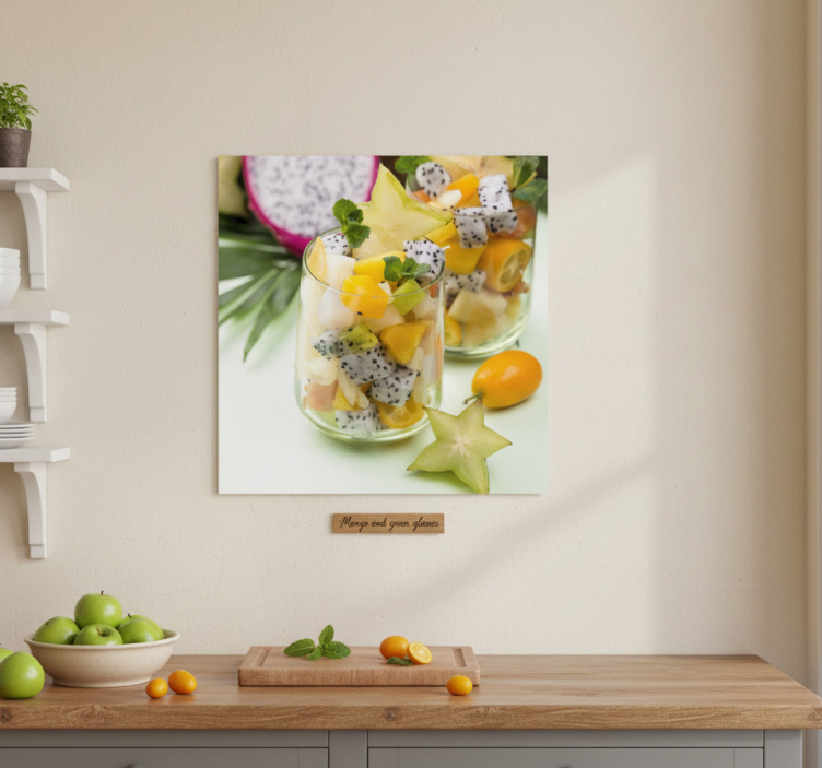 Reference: G598Introducing our stunning Mango and green glasses kitchen poster, a vibrant addition to your kitchen decor! This design showcases a beautiful combination of tropical mangoes and refreshing green glasses, all rendered in high colour intensity that captures the eye. Crafted on 180g/m2 paper with a semi-matt finish, this poster is perfect for adding a lively touch to your space without reflections.