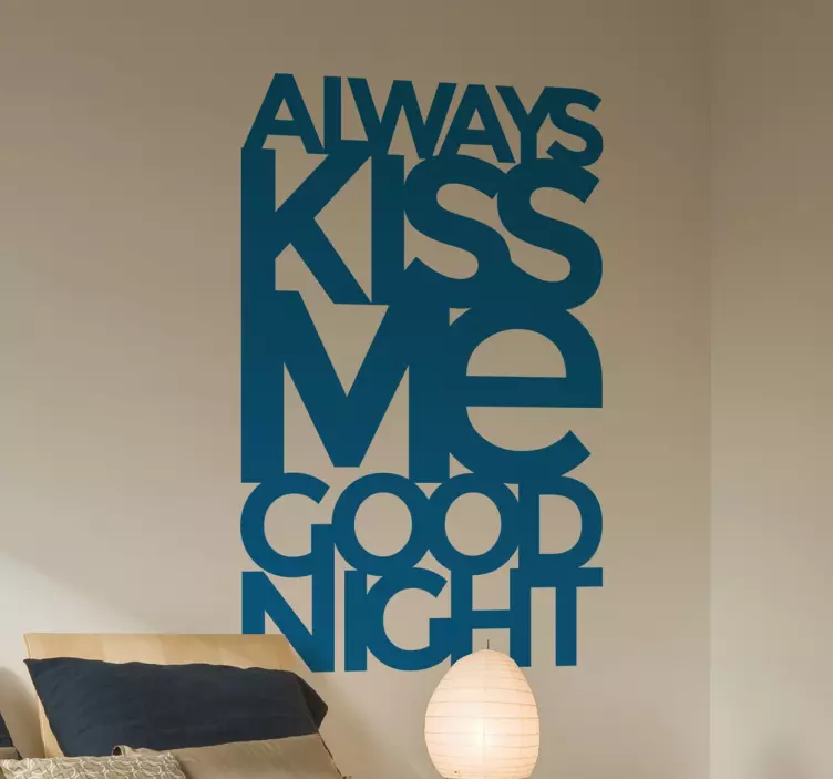 A fantastic Always Kiss Me Goodnight sticker to give your bedroom a personalised touch and a brilliant atmosphere. If you are looking for a quote decal that will create a warm and loving atmosphere in your bedroom then this is the ideal design for you!