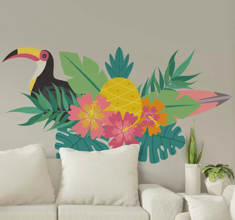 Transform your space with our Animal wall sticker tropical bird design, featuring a stunning array of vibrant colors and lively elements. This design showcases a beautiful toucan perched amongst luscious leaves, exotic flowers, and playful pineapples. With its tropical theme, this wall sticker brings the essence of a lush jungle into your home, creating an atmosphere brimming with positivity and cheer!
