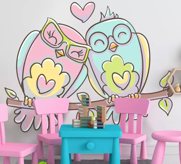 Transform your space with our Bird wall sticker adorable love birds! This charming design features a delightful couple of owls in shades of pink and blue, capturing the essence of love and happiness. The illustration portrays these cute birds in a whimsical and heartwarming manner, perfect for adding a touch of joy to any room.