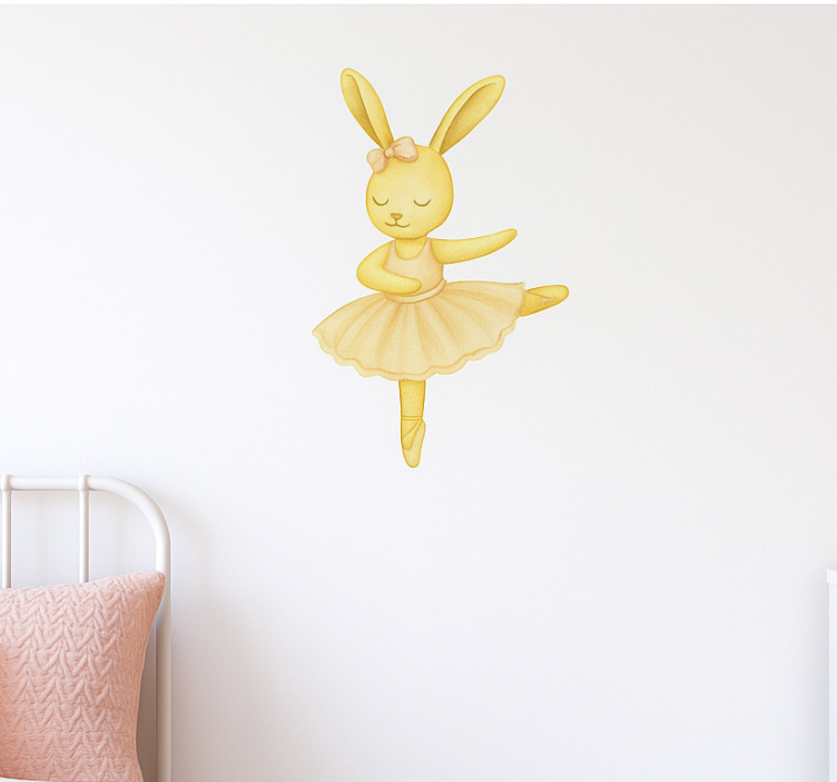 Reference: A54168Transform your child's room into a whimsical wonderland with our Childrens' wall stickers adorable yellow bunny ballerinas. This delightful design features charming yellow bunnies dressed as graceful ballerinas, dancing amidst vibrant flowers and playful patterns. The cheerful colors and enchanting imagery create a joyful atmosphere, perfect for inspiring creativity and imagination in your little ones!