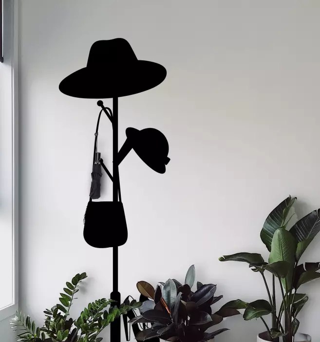 Reference: A51372This sleek, modern hat rack showcases elegant silhouettes of various headwear and a stylish handbag. It's designed to organize and display your favorite accessories, bringing both function and sophistication to your space.