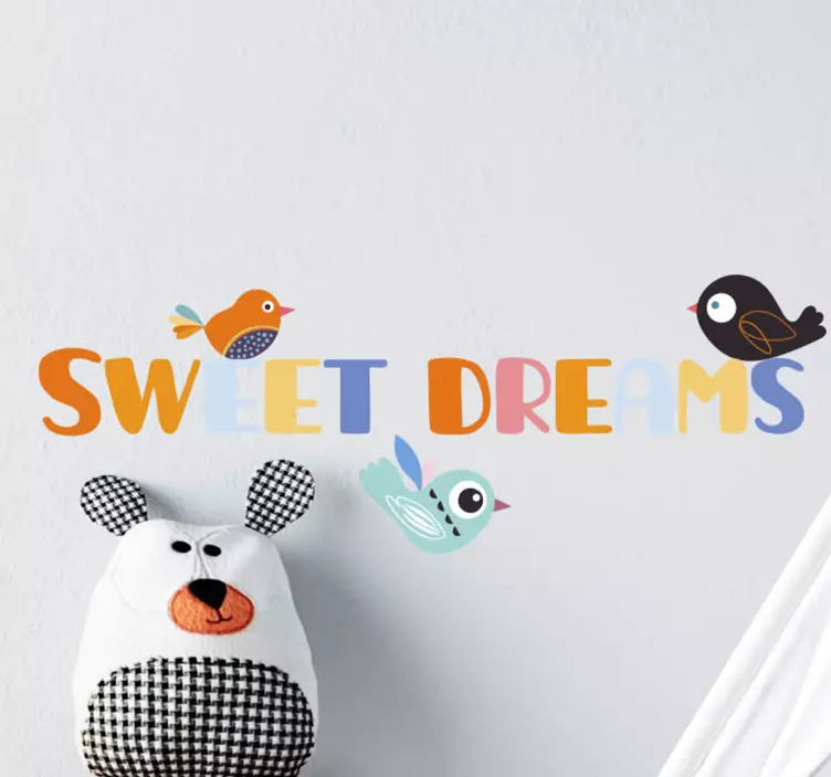 Transform your child's room into a whimsical wonderland with our Colorful nighttime phrase headboard wall sticker. This delightful design features playful illustrations of birds and colorful letters that spell out sweet dreams in a captivating multicolor palette. The child-friendly design is perfect for sparking imagination and creating a joyful atmosphere at bedtime!