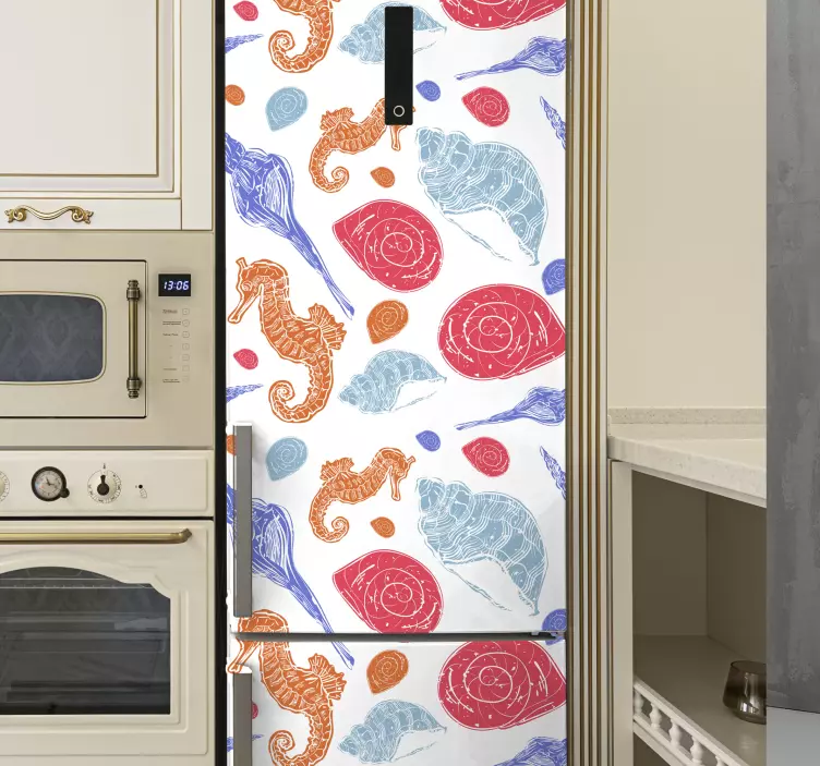 Transform your kitchen with our stunning Fridge sticker seahorse and shells design! This vibrant design showcases a delightful underwater scene featuring playful seahorses and beautiful seashells. The colorful pattern captures the essence of sea life, bringing a touch of the marine world into your home. Perfect for any appliance, this cheerful sticker adds a splash of aquatic charm to your space.