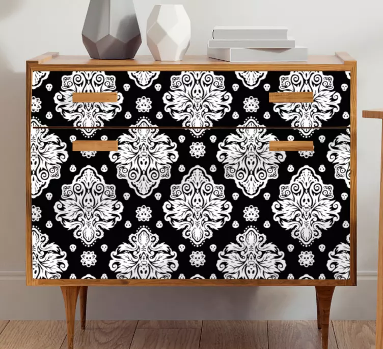 Introducing our Furniture sticker elegant pattern design, a captivating blend of skulls, florals, and damask motifs that come together in an ornate black and white pattern. This modern style design enhances any home interior, making it a stunning choice for those looking to elevate their furniture design with a touch of sophistication!