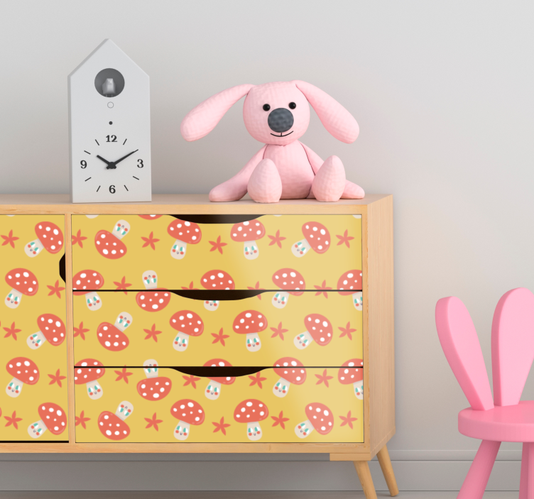 Introducing our enchanting Furniture sticker mushroom pattern design, a delightful blend of whimsical charm and playful aesthetics! This stunning design features vibrant fly agaric mushrooms scattered among twinkling stars, all set against a cheerful yellow background. Perfect for children's decor, this furniture sticker adds a touch of magic to any space, transforming ordinary furniture into a captivating wonderland!