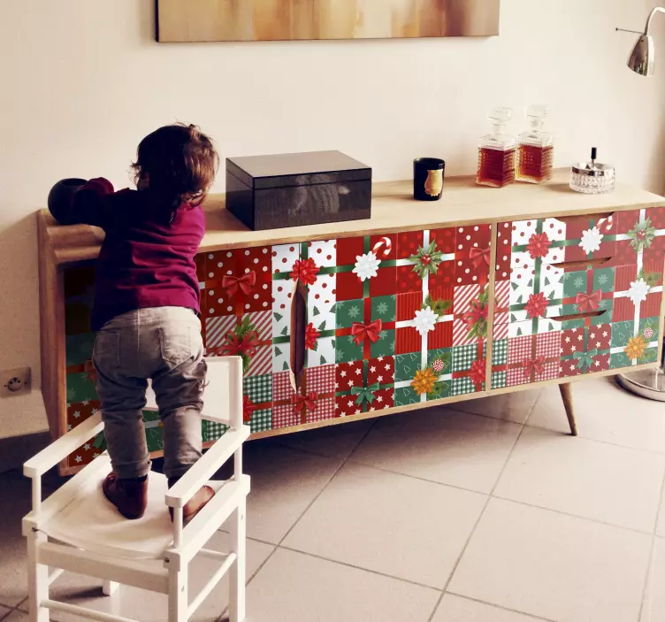 Transform your festive celebrations with our Holiday sticker for festive gift wrapping. This delightful design features a charming pattern of red and green squares adorned with decorative bows, perfectly capturing the essence of Christmas. Imagine wrapping your gifts in a beautiful tapestry of furniture and presents, creating a warm and inviting atmosphere for all your loved ones!