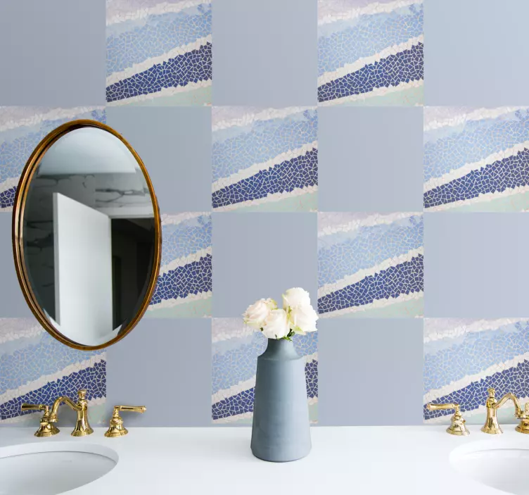 Introducing our stunning Location sticker abstract patterned mosaic, a vibrant blend of blue tones and geometric shapes that beautifully emulate the charm of traditional tiles. This textured design features captivating waves and mosaic patterns that can enhance any interior style, bringing a fresh and modern touch to your living space!
