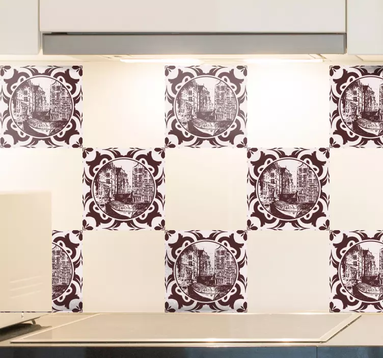 Transform your space with our Location sticker historic canal view, an exquisite design that beautifully captures the essence of European architecture. Featuring charming houses, a serene canal, intricate tile patterns, and a captivating cityscape, this decorative piece adds a touch of elegance and cultural charm to any room!