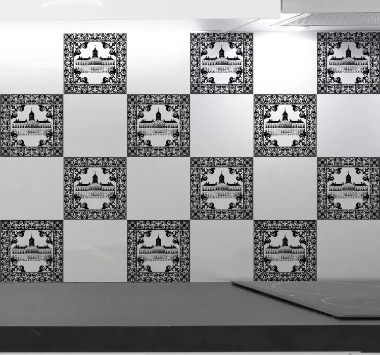 Reference: A47180Featuring intricate patterns surrounding a prominent architectural structure, this design creates a striking visual impact. The contrast of black and white adds depth and character, making it a stylish choice for various spaces. A unique blend of elegance and boldness defines this captivating tile pattern.