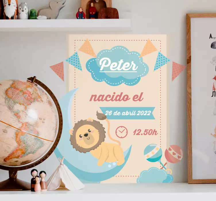 Reference: A49737A charming design featuring a playful lion resting on a crescent moon, surrounded by colorful flags and balloons. Ideal for commemorating special moments, this personalized product adds a joyful touch to any space, making it perfect for celebrations and welcoming a new arrival.