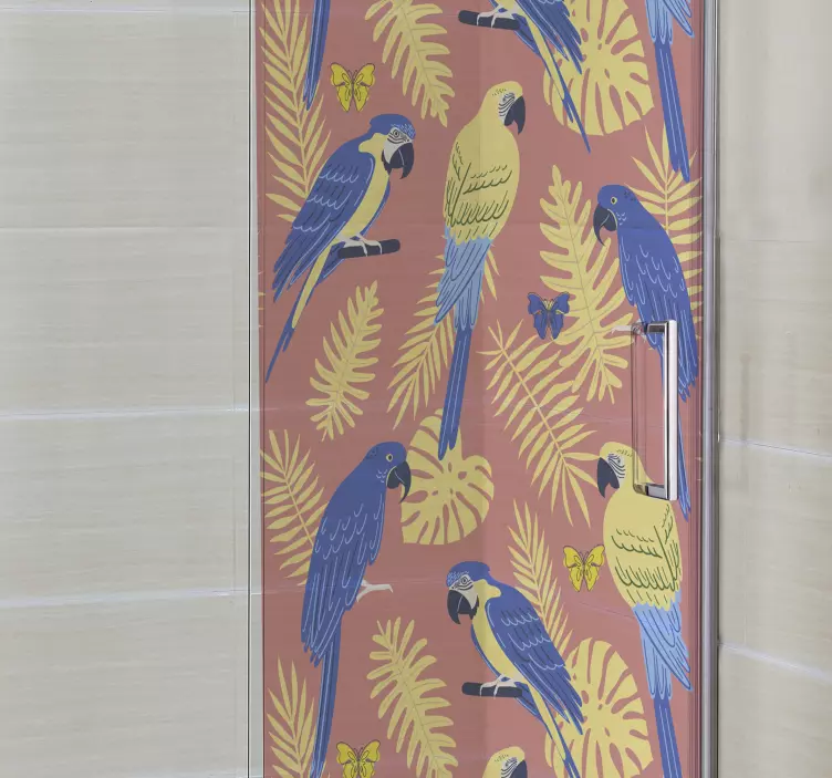 Transform your space with our Shower screen sticker colorful parrots design, a vibrant depiction of tropical life! This stunning design features macaws and parrots fluttering among lush leaves and delicate butterflies. The rich colors of yellow and blue bring nature right into your bathroom, creating a lively atmosphere that celebrates tropical beauty. Let your shower door become a canvas of life with this leafy, vibrant masterpiece!