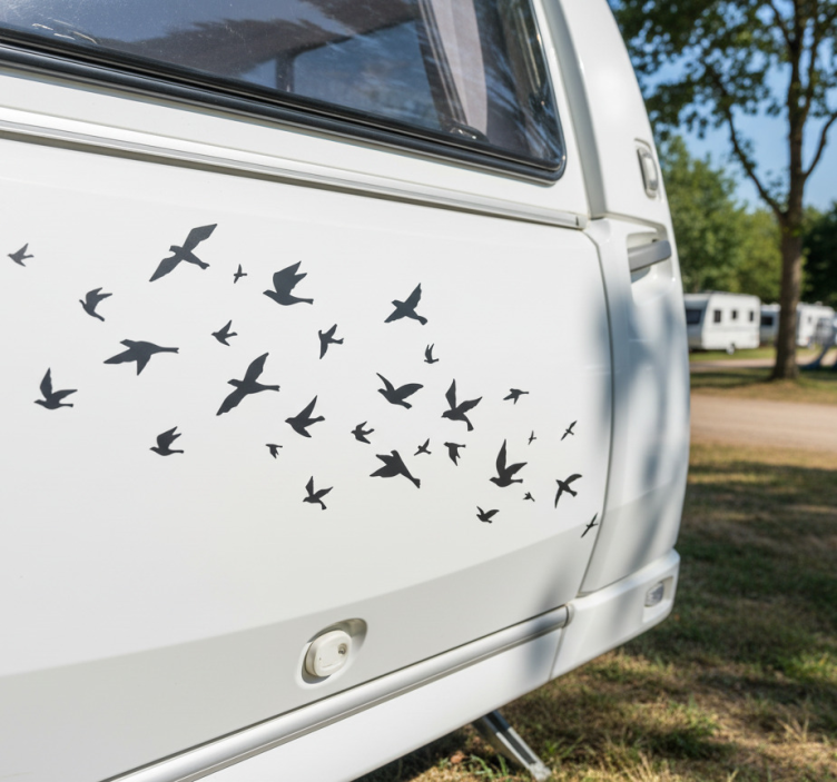 Reference: A54718Transform your campervan with our stunning Soaring birds flock campervan decal. This beautifully designed decal features a graceful flock of birds in flight, evoking a sense of freedom and adventure. The elegant silhouettes are crafted to blend seamlessly with your vehicle's exterior, adding a touch of nature and artistry that will surely catch the eye of anyone passing by!