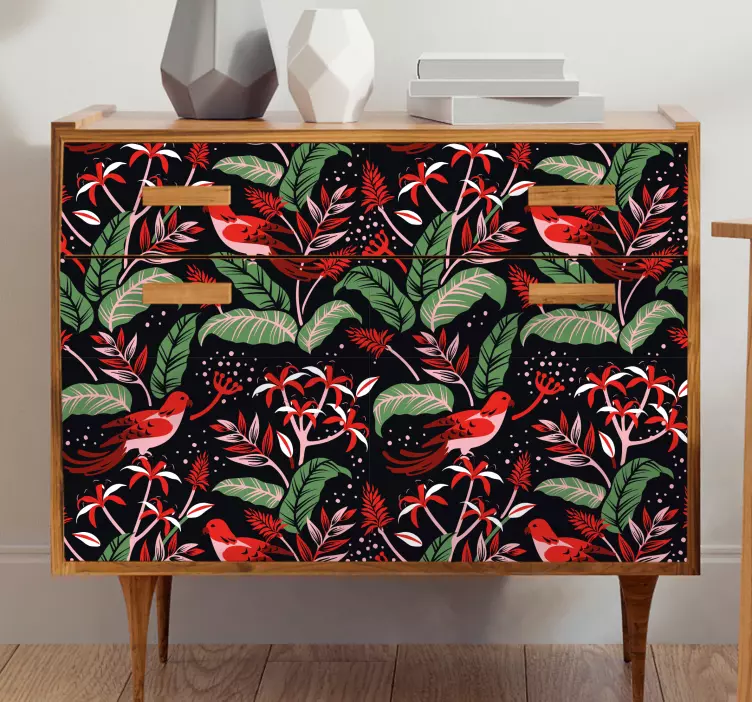 Reference: A53481A vibrant tropical floral pattern featuring red birds and lush green leaves against a dark background. The design combines various floral elements with lively colors, creating an energetic and fresh atmosphere, perfect for adding a touch of nature to any setting.