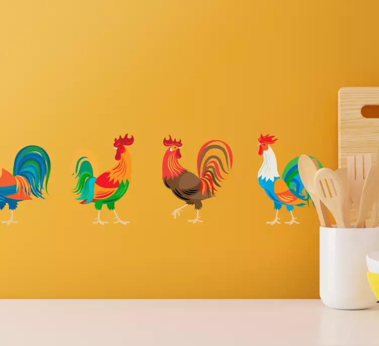 Transform your space with our vibrant Wall border sticker colorful rooster display! This delightful design features charming roosters set against a colorful backdrop, perfect for adding a touch of farm-inspired whimsy to your kitchen or dining area. Each element of the design brings a lively and cheerful ambiance, making your walls come alive with a sense of warmth and joy.