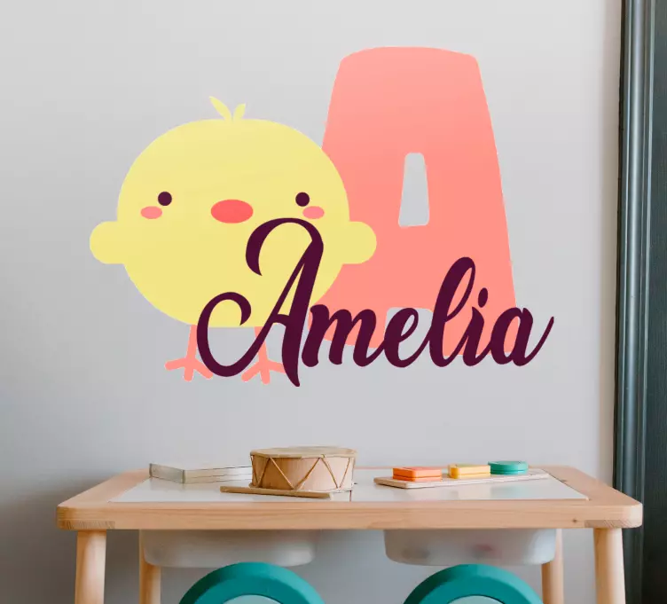 Reference: A48924A charming chick design features a friendly yellow chick alongside a colorful initial and customizable name. This playful element is perfect for creating a delightful atmosphere in a child's space, adding warmth and individuality to their room.