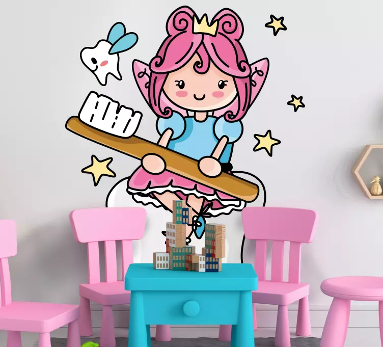 Transform your child's room into a whimsical wonderland with our Wall stickers for kid tooth fairy character. This enchanting design features a playful tooth fairy surrounded by charming elements like a toothbrush and delightful tooth illustrations. The overall aesthetic is cute and vibrant, predominantly in shades of pink, which adds a touch of fantasy and cheerfulness to any children's room. With its smiling character, this wall sticker invites imagination and joy, making it a perfect addition to your little one’s space!