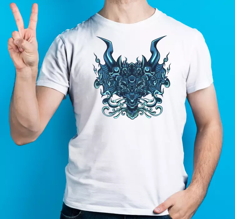 Introducing the Fierce horned creature t-shirt, a bold and artistic expression of mythical horror! This stunning design features a dragon-like creature with a menacing head, complete with dramatic horns that evoke a sense of fear and fascination. The vibrant blue color adds depth to the artwork, making it an eye-catching piece that captures the essence of Nipponese horror and the allure of the evil and scary.