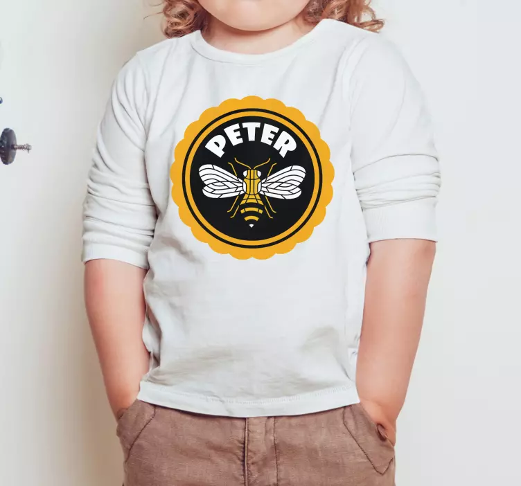 Reference: T4984This charming design features a vibrant bee illustration encircled by a bold yellow scalloped border. The name 'Peter' prominently displayed adds a personalized touch, making it perfect for kids. The combination of playful colors and an engaging motif creates an appealing look for children's wear.