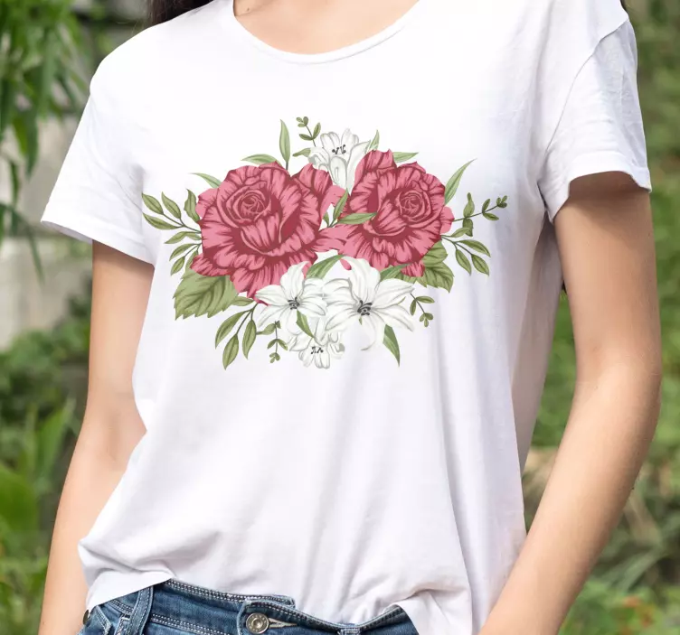 Reference: T4320This design features blooming roses and lilies, symbolizing beauty and elegance. The vibrant colors stand out, creating a striking visual appeal. Perfect for casual wear, it showcases a harmonious blend of floral elements, making it an ideal choice for anyone wanting to convey a fresh, uplifting vibe.