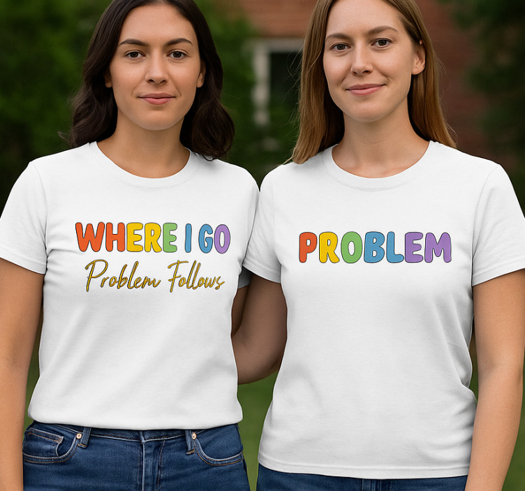 The Lgbt wherever i go problems follow couple t-shirt is a vibrant expression of individuality and love! This eye-catching design features a playful graphic that communicates a bold message, crafted with a blend of 85% cotton and 15% viscose. The t-shirt comes with a comfortable round neck and short sleeves, making it perfect for any casual outing. Available in classic black and white, this t-shirt is designed for adults, children, and even babies, ensuring that everyone can show their pride in style.