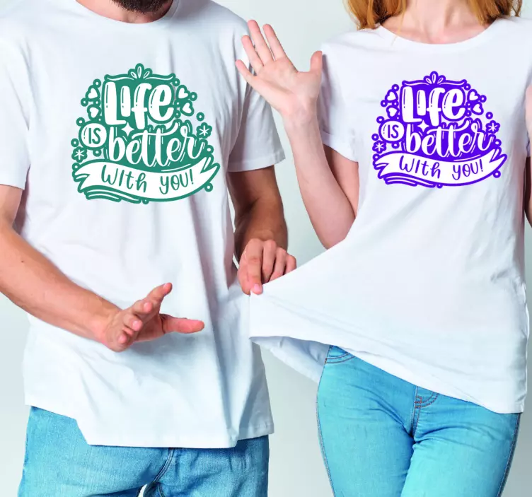Reference: T4107This design highlights a cheerful message emphasizing the joy of companionship. Displayed on matching apparel, the vibrant text and embellishments create a warm atmosphere, perfect for expressing love and unity. Ideal for celebrations or casual outings, it resonates with themes of connection and happiness.