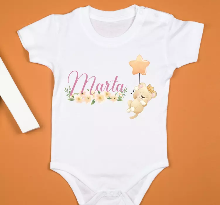 Reference: T5219This charming design features a cute bear holding a star balloon, complemented by delicate floral elements. The name 'Marta' is elegantly integrated into the artwork, creating a joyful and personalized touch perfect for babywear.