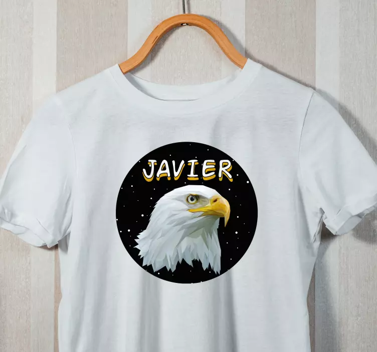 Introducing the T-shirt with name eagle head by javier, a stunning piece that showcases a beautiful eagle head design, perfect for nature lovers! This striking graphic features a majestic bird that embodies strength and freedom, complemented by delicate stars that enhance its artistic flair. Made from high-quality materials, this personalizable t-shirt allows you to add your name, making it uniquely yours. With a color palette of white and yellow, it embodies the essence of wildlife and personal expression!