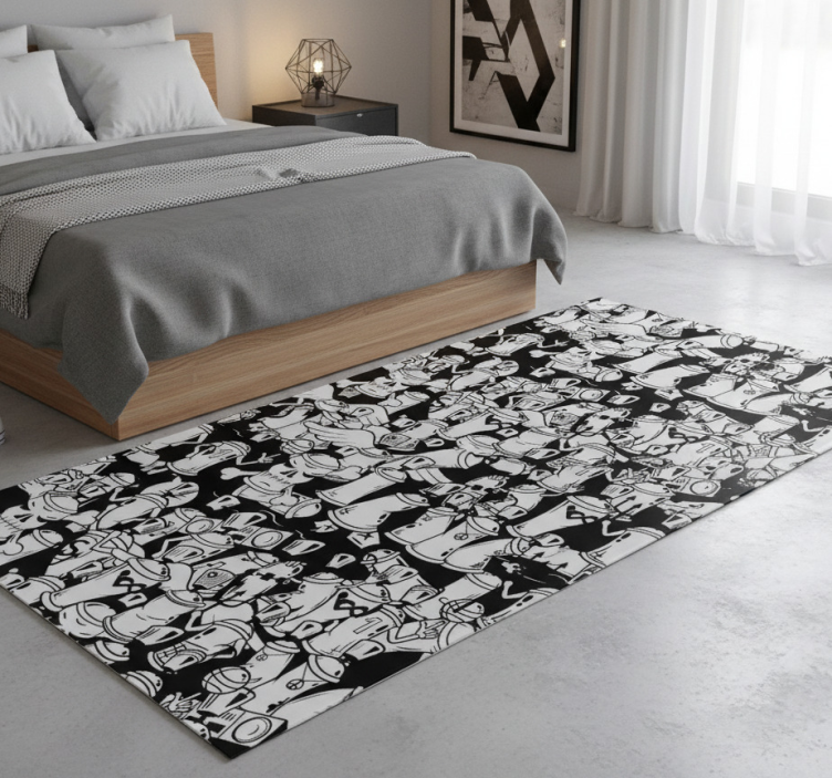 Bedroom vinyl rug featuring black and white spray cans